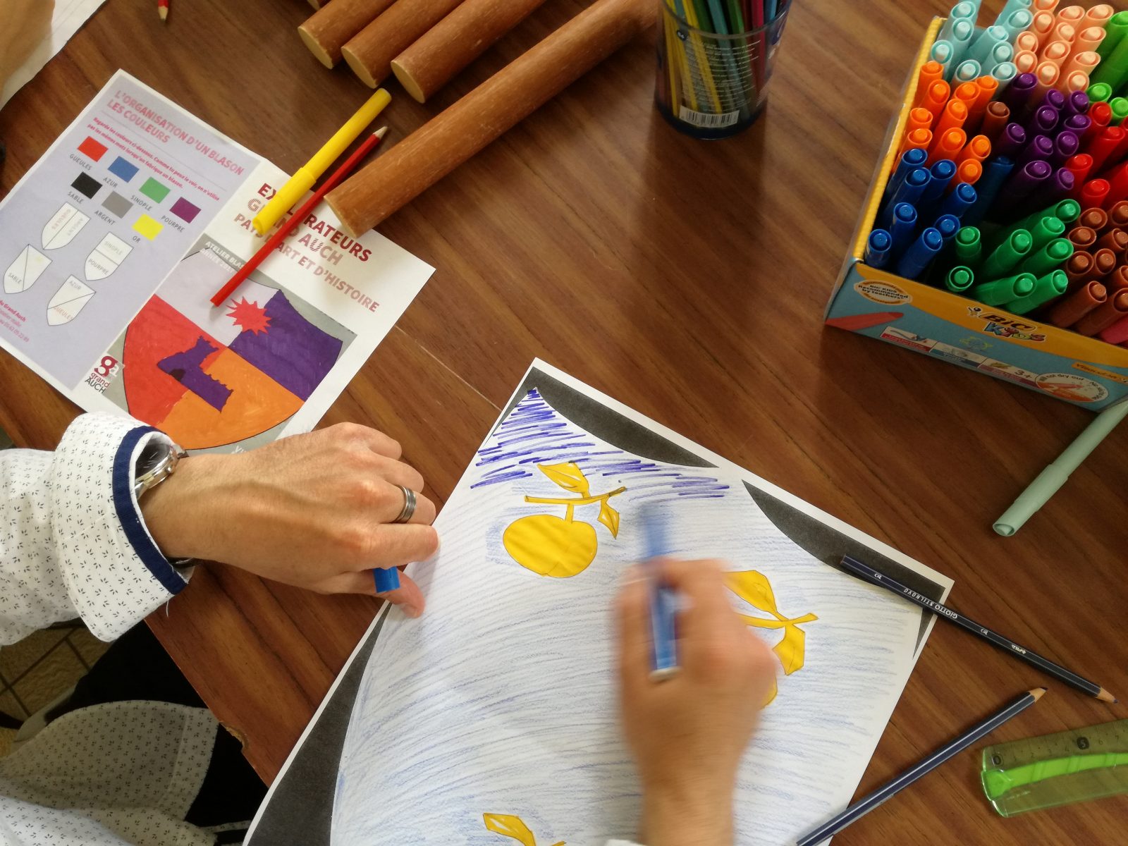 Dans la salle des illustres de l'hôtel de ville, parents et enfants partent à la rencontre de différents blasons et armoiries. Leur mission : apprendre à les reconnaître et comprendre leur signification. Afin de percer les secrets de cet art médiéval, ils s’initient tout au long de l’atelier aux techniques et règles de l’héraldique puis réalisent un blason.