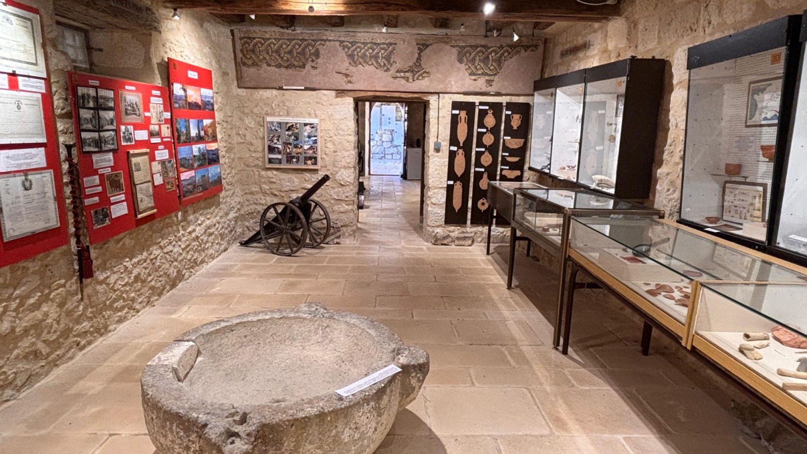 Les collections présentées illustrent une occupation humaine continue, depuis la Préhistoire jusqu’à l’époque contemporaine. Le visiteur peut y découvrir des outils en pierre taillée, des objets de la vie quotidienne gallo-romaine, des éléments architecturaux antiques, des fragments de mosaïques, ainsi que des vestiges témoignant de l’évolution des modes de vie ruraux. Parmi les pièces remarquables figurent notamment des molaires de gomphotherium, vestiges exceptionnels d’un mammifère préhistorique vieux de plusieurs millions d’années.