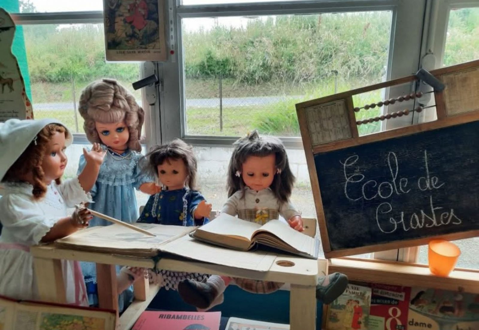 La deuxième partie, une salle de classe rassemblant les jouets éducatifs : des tampons, des cubes, d’anciens livres d'écriture et une école miniature représentant l'école de notre enfance.