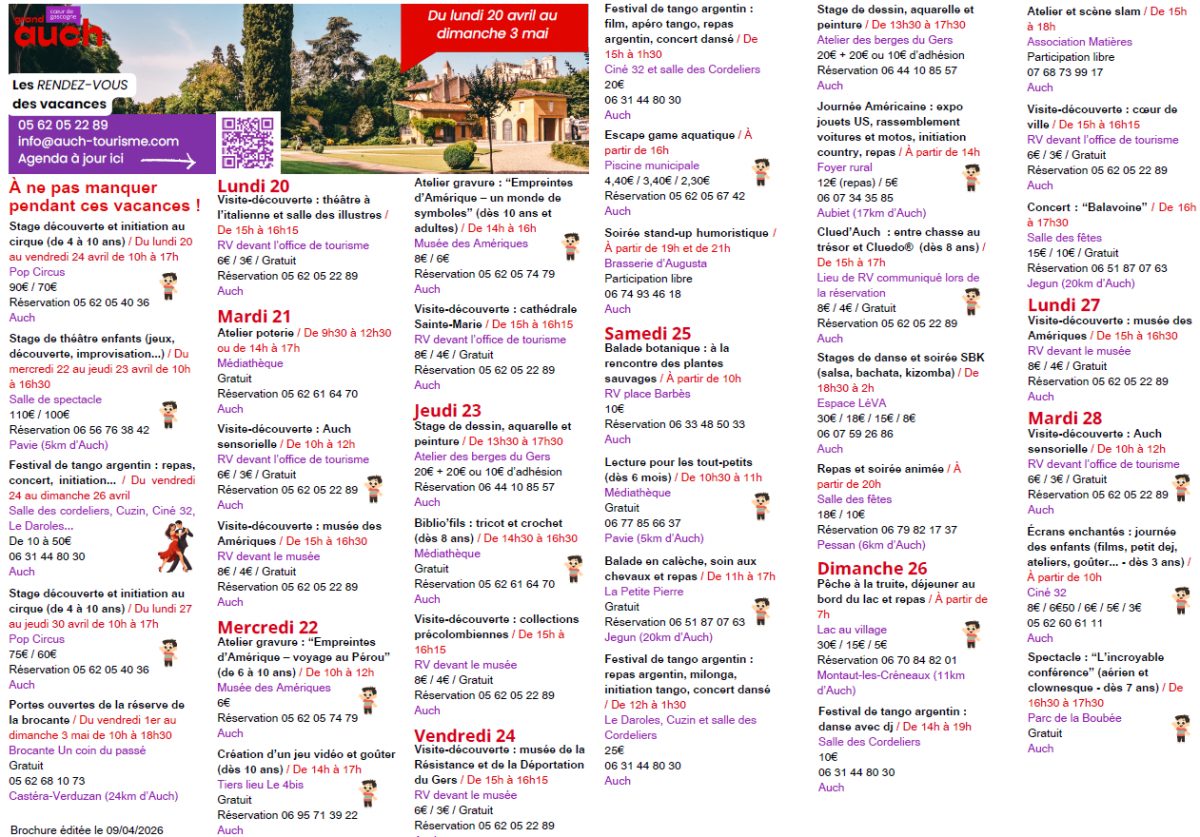 Ces vacances s’annoncent riches en animations dans le Grand Auch Coeur de Gascogne. Voici votre agenda des animations du lundi 20 avril au dimanche 3 mai, facile à télécharger et/ou imprimer (pour l’afficher chez vous, par exemple). En dessous, ce sont nos trois coups de cœur de ces vacances !